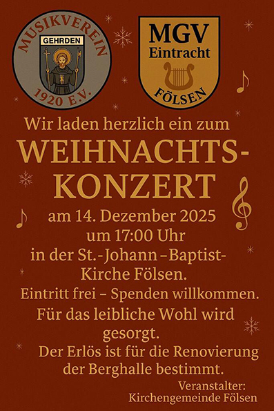 Am 14.12.2025 lädt die Kirchengemeinde zusammen mit dem Männergesangverein Fölsen sowie dem Musikverein Gehrden zu einem Weihnachtskonzert in der St. Johannes Baptist Kirche Fölsen ein.
